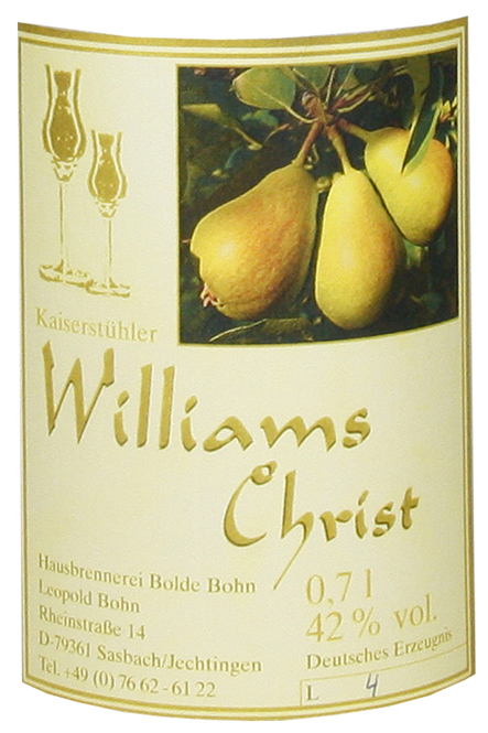 Die Birnen dieses hochwertigen Williams-Birnenschnapses werden am Kaiserstuhl auf den Obstwiesen von Bolde Bohn selbst angebaut. Sie zählen zu einer seiner stolzesten Fruchtsorten, der er pflegt und erntet.