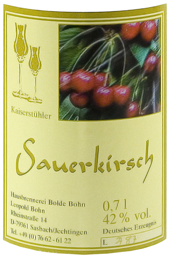 Die Sauerkirschen dieses außergewöhnlichen Sauerkirschschnapses werden auf der Sauerkirsch-Obstwiese des Kaiserstühler Edelbrenners Leopold Bohn angebaut. Sie wachsen auf Lös- und Humuserde und die Sauerkirsch-Bäume werden sehr pfleglich von ihm umhegt (professionelles und besonderes Schneiden der Obstbäume).