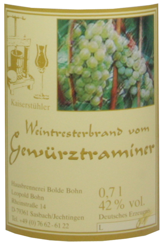 Mit diesem Weintresterbrand von der Gewürztraminer-Traube erleben Sie einen Hochgenuss vom Kaiserstuhl.