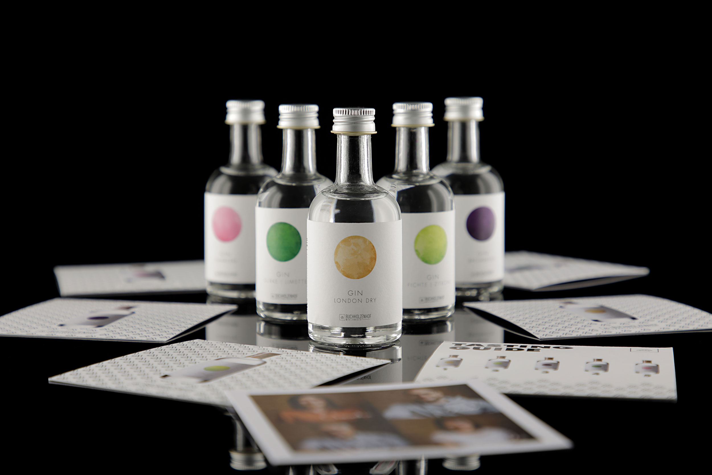 Inhalt der Tasting-Box: Fünf ausgewählte Miniatur-Flaschen à 50 ml mit besonderen Gin-Sorten zum Probieren
