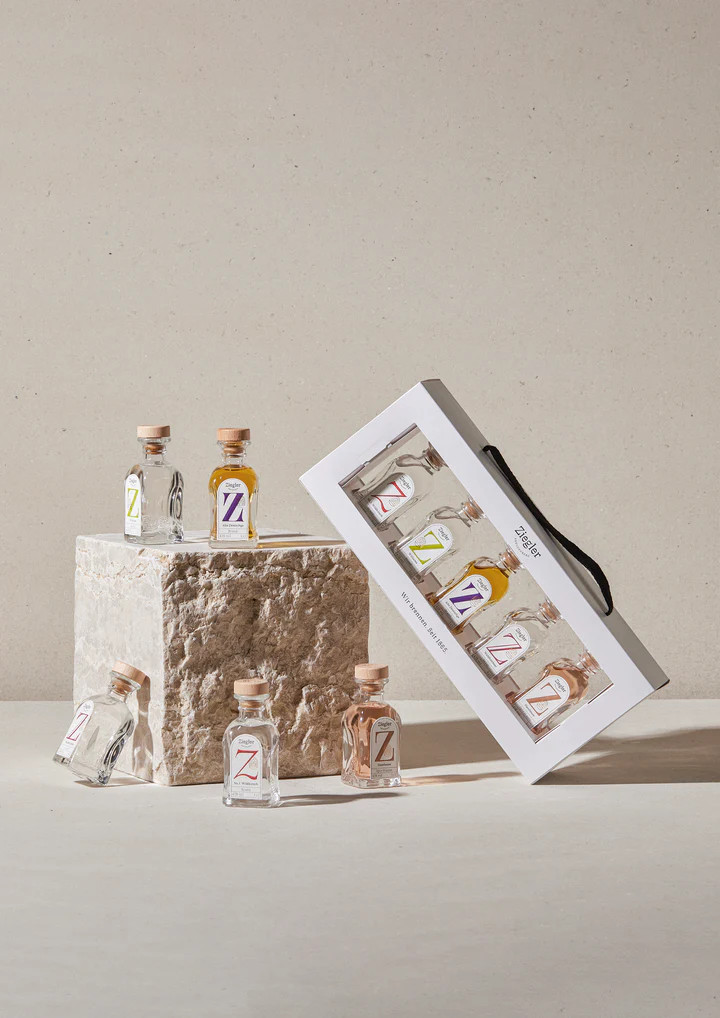 Klein und fein – unsere Auswahl für Zwischendurch ist unser persönliches „Tasting Menu“. Hier können Sie sich durch unsere flüssige Vielfalt kosten. Mal fruchtig, mal süß, nehmen Sie unsere Miniaturen auf eine kleine Reise durch die Ziegler-Welt mit. Unsere bunt gemischten Fläschchen kann man übrigens äußerst gut zu Geburtstagen, Feiern und Jubiläen verschenken.