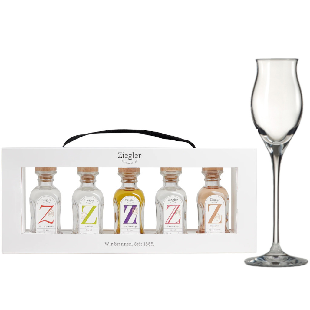 Inhalt: Ziegler No. 1 Wildkirsch 43%vol. 0,05l, Ziegler Williams 43%vol. 0,05l, Ziegler Alte Zwetschge fassgelagert 43%vol. 0,05l, Ziegler Waldhimbeergeist 43%vol. 0,05l, Ziegler Haselnuss43%vol. 0,05l.