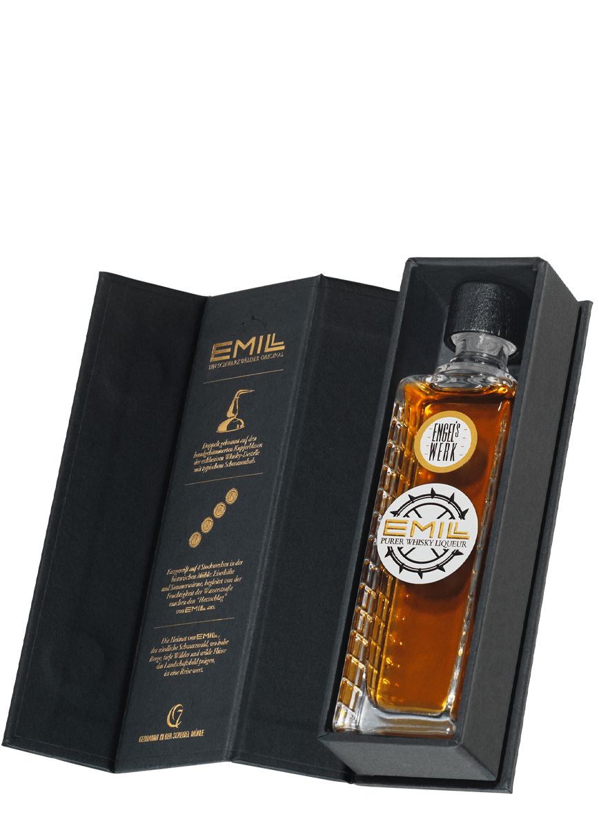 EMILL Engelswerk ist ein purer Whisky-Likör. Er ist ein echtes Schwarzwälder Original, gebrannt und gelagert in der historischen Scheibel Mühle in Kappelrodeck im Achertal. Ganz anders als bei Likören üblich, verzichten wir in der EMILL ENGELSWERK Rezeptur bewusst auf die Zugabe von weiteren Aromen oder Zutaten. ENGELSWERK ist eine Whisky-Cuvée, abgerundet zu einem puren Whisky-Likör.
