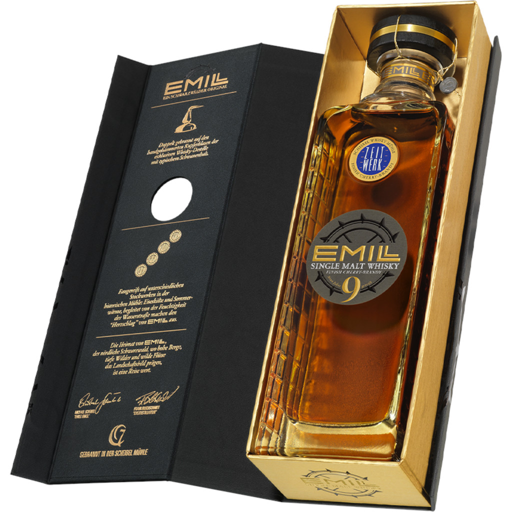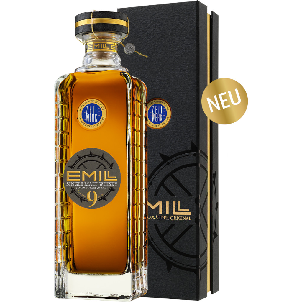 EMILL ist ein echtes Schwarzwälder Original, gebrannt und gelagert in der historischen Scheibel Mühle in Kappelrodeck im Achertal. Neun Jahre durfte EMILL ZEITWERK in der Scheibel Mühle in außergewöhnlichen Fässern reifen. Eiseskälte und Sommerwärme machen seinen „Herzschlag“ aus und verleihen diesem neunjährigen Single Malt Whisky einen atemberaubenden Charakter.