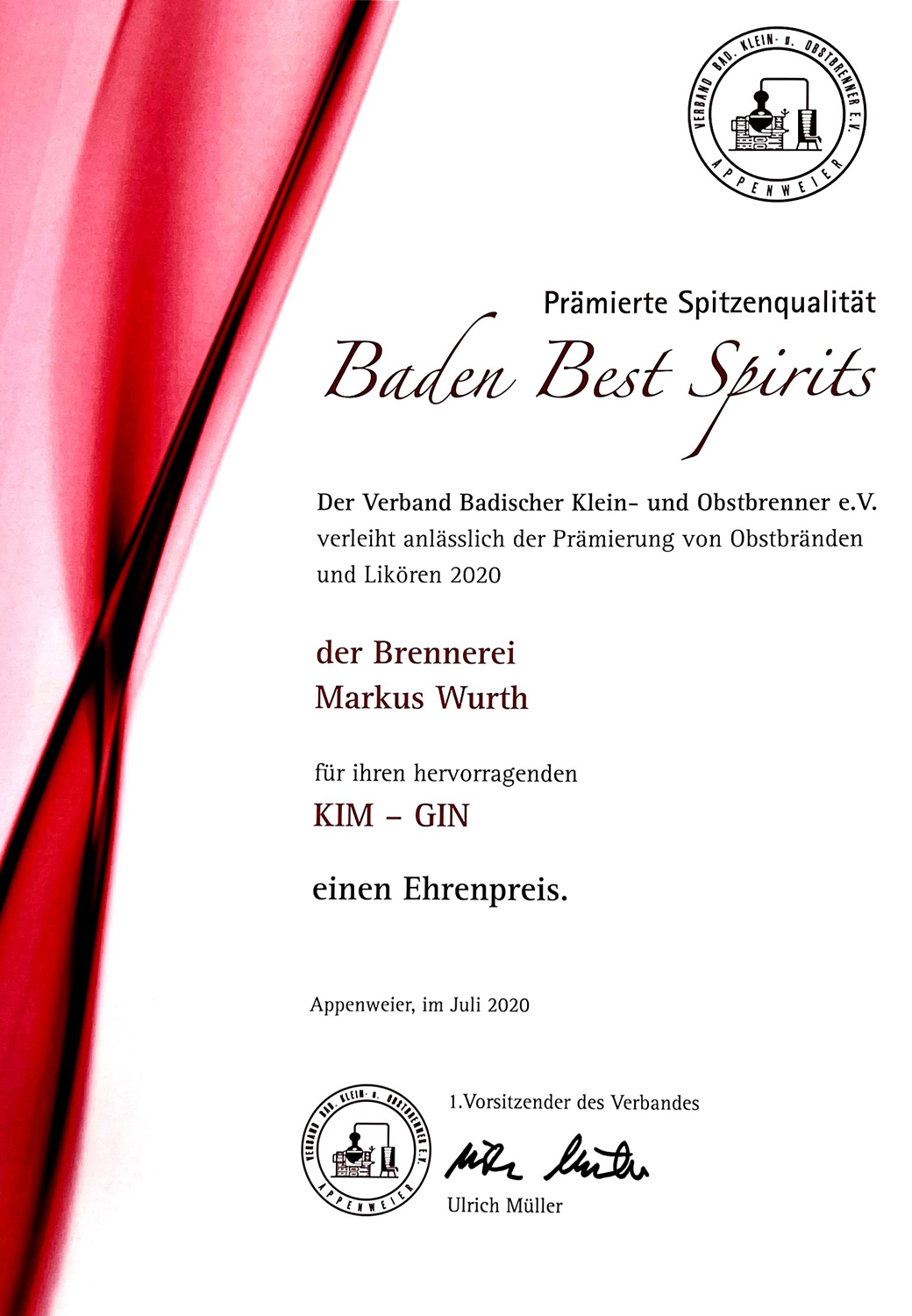 Kim-Gin wurde ausgezeichnet mit dem Ehrenpreis mit 20 von 20 Punkten bei Baden Best Spirits.